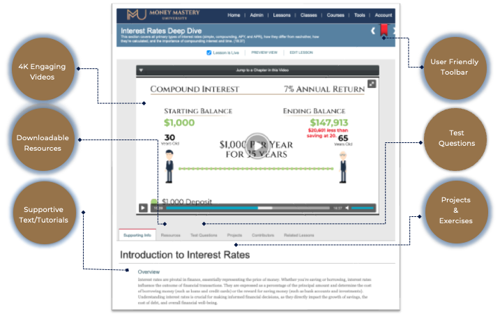 Engaging, expert taught, high-resolution educational videos that break down complex financial concepts into easy-to-understand, real-world applications. These videos go beyond the basics, incorporating equations, step-by-step math walkthroughs, and deep dives into key concepts—ensuring students stay captivated and eager to learn, with more than just a talking head on screen.